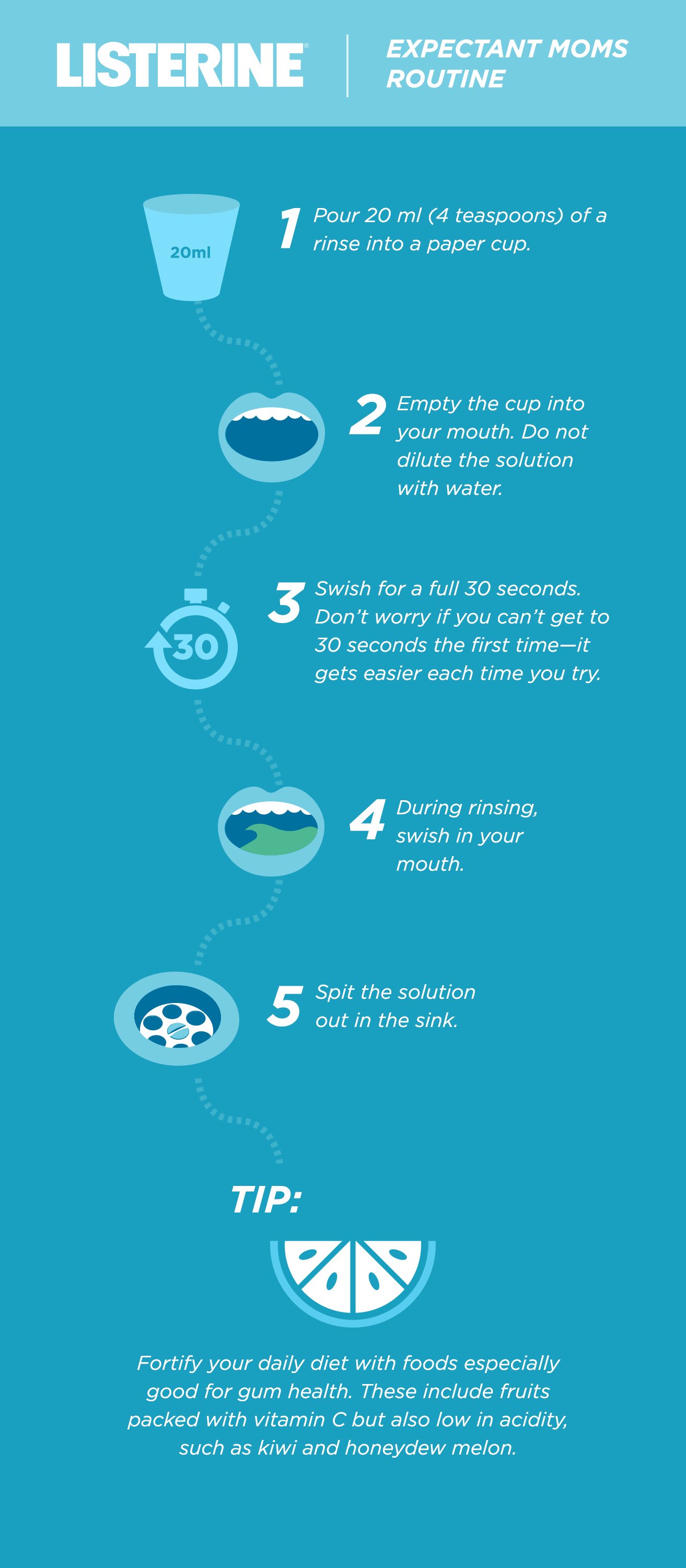 In fact, one study found that many pregnant women need better dental care to protect their gums and teeth. To protect your oral health, follow this rinse-routine twice daily so you have one less thing to worry about over the next 9 months.